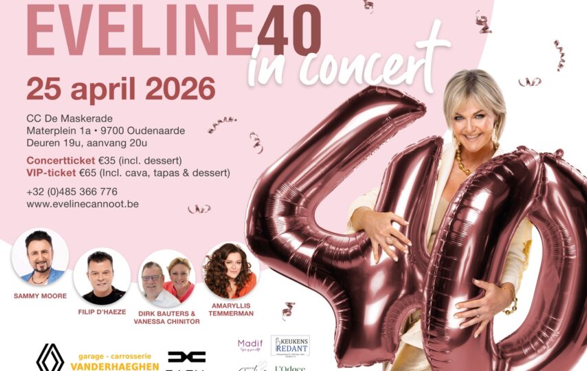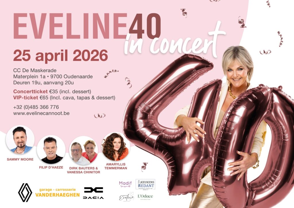 Op zaterdag 25 april 2026 wordt het podium van CC De Maskerade in Oudenaarde omgetoverd tot het kloppend hart van een bijzonder verjaardagsfeest. Eveline Cannoot viert dan haar 40ste verjaardag met een uniek concert. Een verjaardag vieren kan op veel manieren, maar Eveline kiest resoluut voor wat haar het meest typeert: muziek, verbondenheid en pure emotie. Het belooft een avond te worden vol warmte, herkenning en verrassingen, omringd door fantastische artiesten die samen met haar het podium delen. Duetpartner Sammy Moore, met wie ze momenteel op 1 staat in onze Vlaamse Top 20, mocht uiteraard niet ontbreken. Ook MENT-collega’s Filip D’haeze en Amaryllis Temmerman zullen erbij zijn, net als Vannessa Chinitor en Dirk Bauters. Reserveren kan via www.evelinecannoot.be.