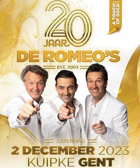 In 2023 is het meer dan ooit ‘Viva De Romeo’s!’, want dan bestaat Vlaanderens favoriete partyband twintig jaar. U leest het goed: 20 jaar!! Dat vraagt natuurlijk om een waanzinnig verjaardagsfeestje en dus pakken Romeo’s Chris Van Tongelen, Davy Gilles en Gunther Levi grootser uit dan ooit. Op zaterdag 2 december 2023 is het iconische Kuipke in Gent the partyplace to be voor de total loss jubileumshow ’20 Jaar De Romeo’s’. Verwacht je aan al hun grootste hits, straffe medleys, verrassende en leuke gastartiesten, een ijzersterke liveband, toeters, bellen en dat alles met een GOUDEN randje! ’20 Jaar De Romeo’s’ is hét gouden verjaardagsfeestje dat je absoluut niet wil missen!